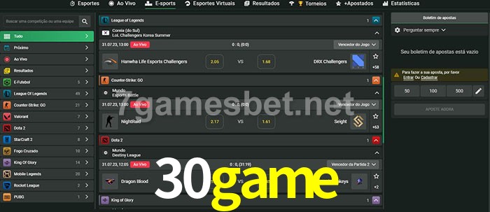 O 30game oferece uma grande seleção de opções de apostas em e-sports com probabilidades competitivas